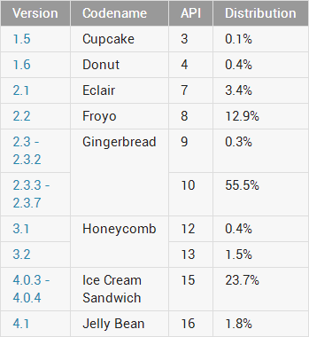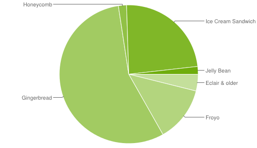 Android 2.3 (Gingerbread) sigue siendo la versión más usada con el 55,8 %, tan sólo pierde 1,7 puntos del mes pasado, y la tercera versión más usada, Android 2.2 (Froyo), pasa del 14% al 12,9%. Android 3.1 y 3.2 (Honeycomb) tienen ahora el 1,9% de cuota y las tres versiones más antiguas de Android conjuntamente consiguen el 3,9%.