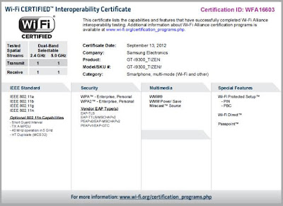 El mejor ejemplo de que Samsung pretende que el Galaxy S III esté en el candelero durante muchos meses es cuando conocimos los nuevos colores de la carcasa del terminal (más allá del azul o el blanco) o la aparición de una versión con 2 GB de RAM (GT-I9305) en vez de 1 GB. Ahora, la página de noticias Übergizmo ha filtrado un certificado de operatividad Wi-Fi para un dispositivo denominado GT-I9300 Tizen o lo que es lo mismo, el Galaxy S III. Según este documento el terminal en cuestión podría operar con Wi-Fi a, b, g y n, así como Direct.